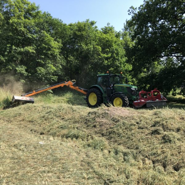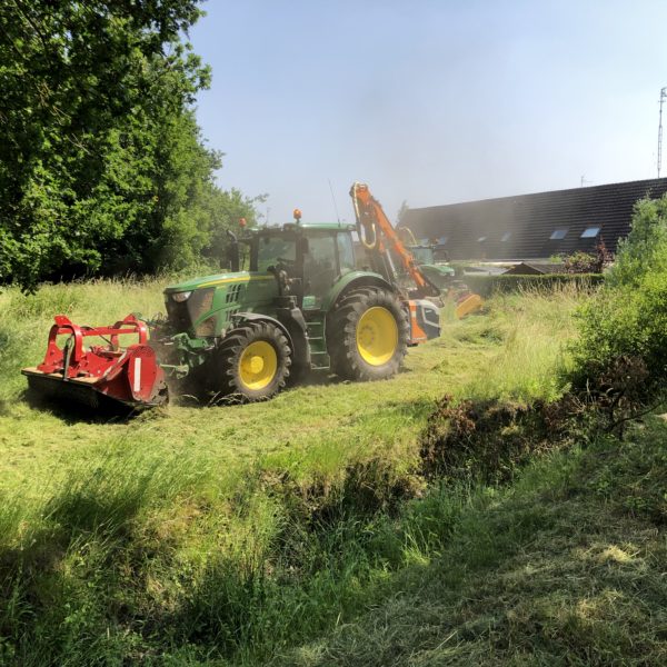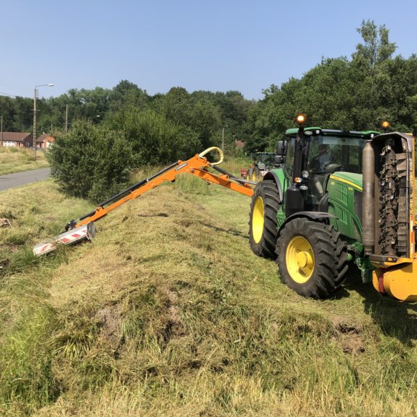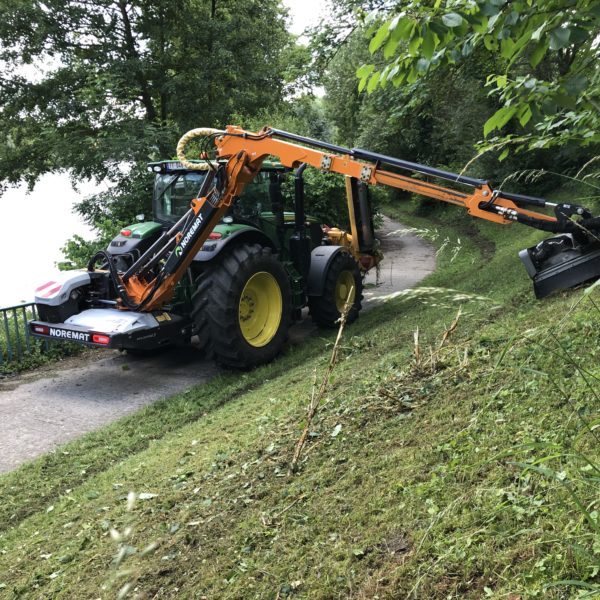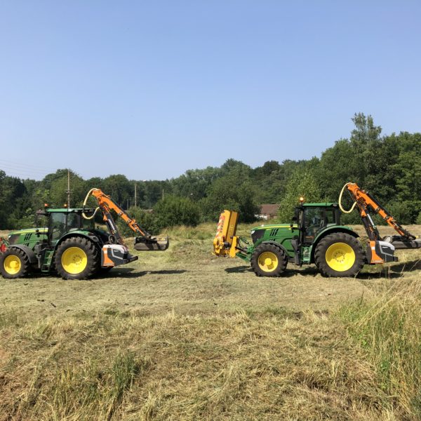 DEE dispose de 3 groupes de fauchage composés de tracteurs John Deere, équipés de broyeurs frontaux de type Gyrax et Seppi ainsi que 3 bras de type Noremat et Rousseau d’une longueur de 7,5m.
